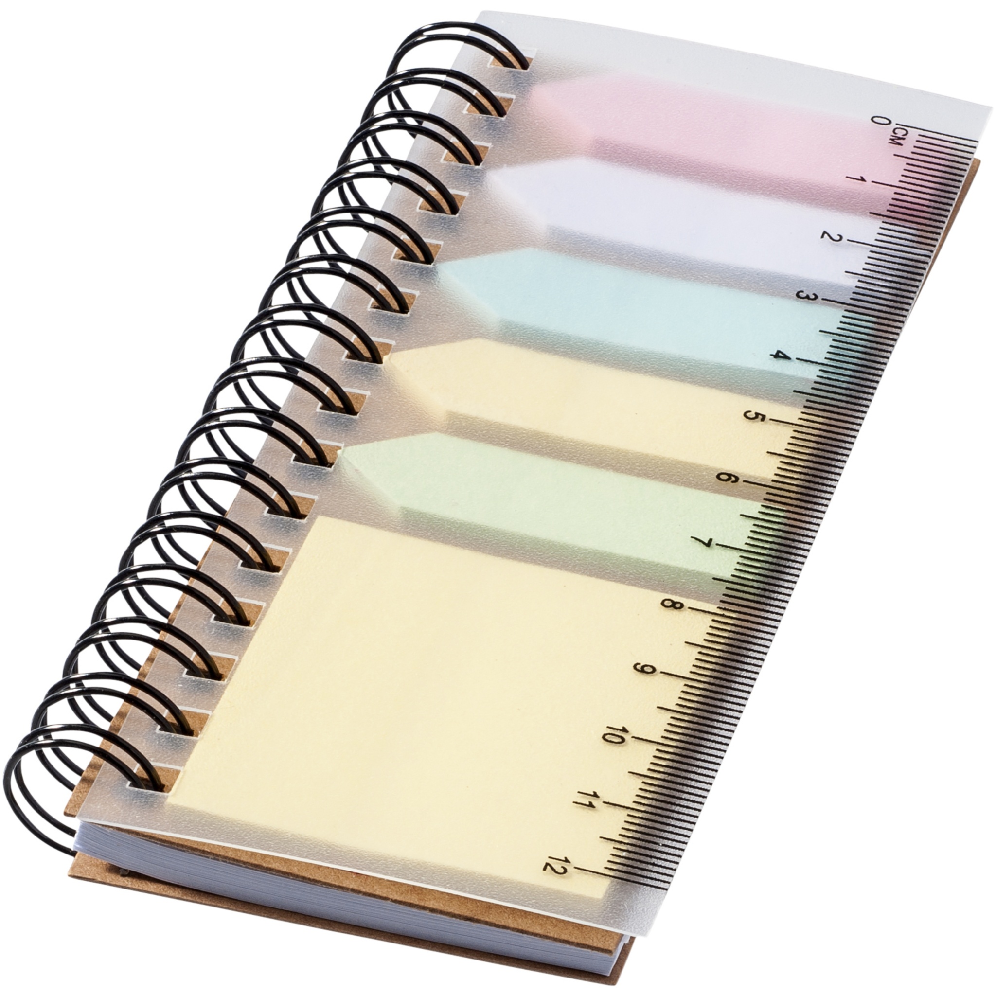Блокнот с 25 страницами клейких листочков 5 цветов и 40 страницами линованной белой бумаги. Включает линейку на передней обложке.