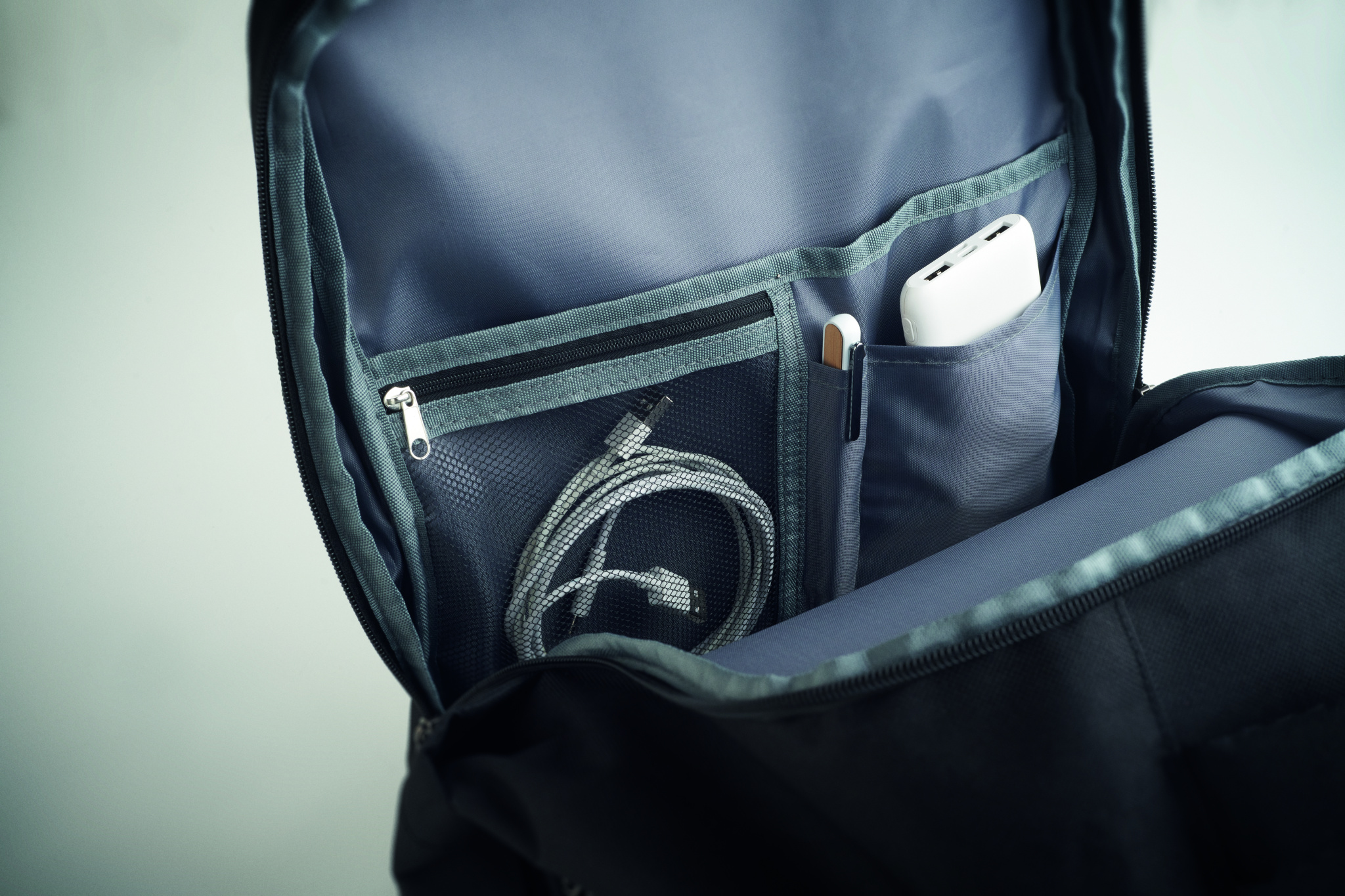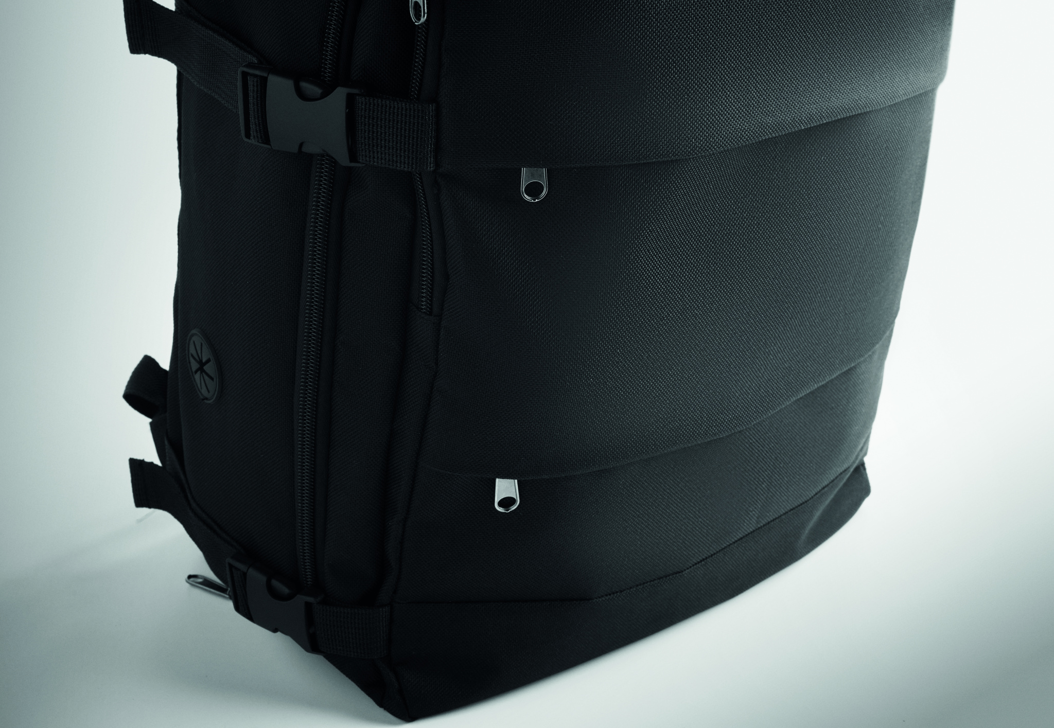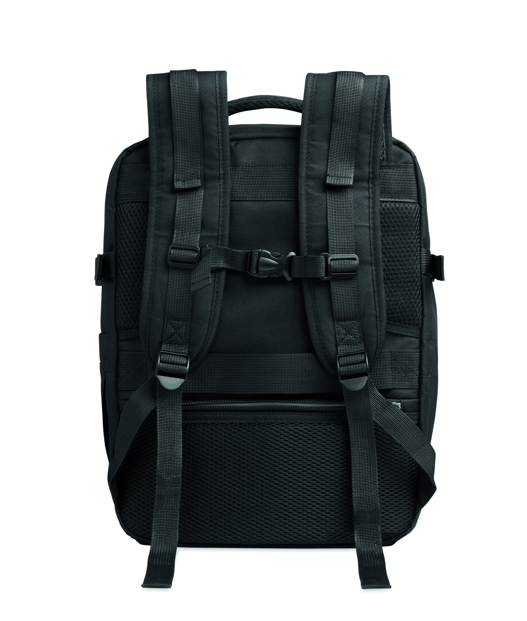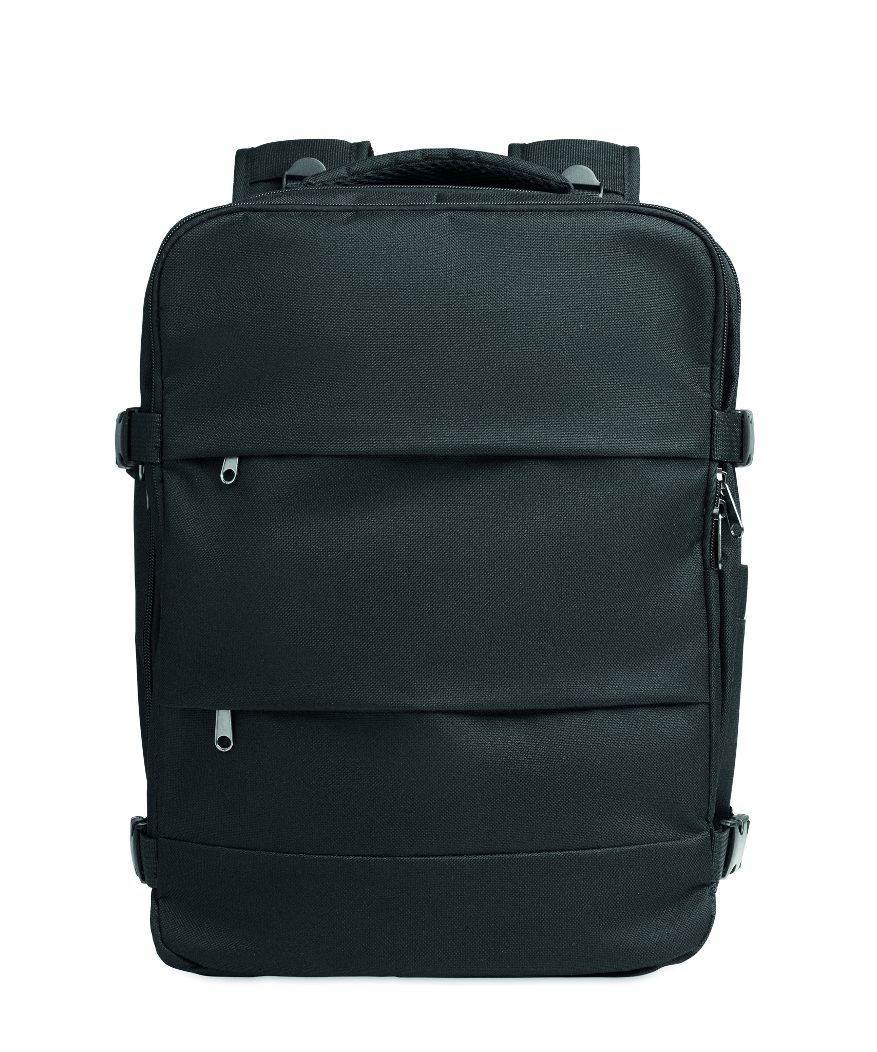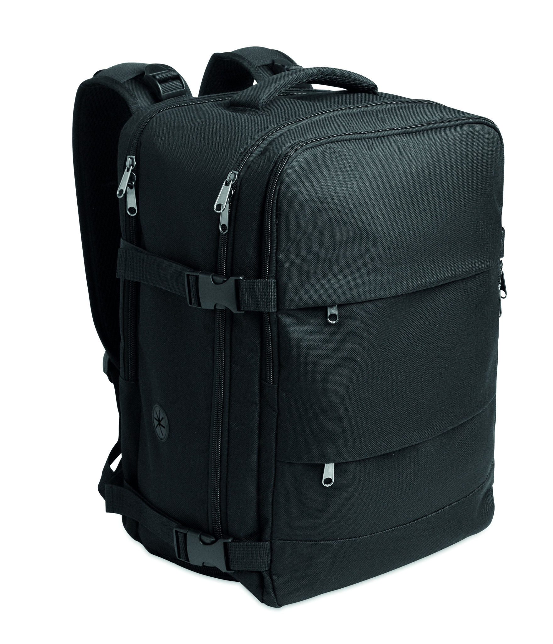 Cabin-size extendable backpack in 600D RPET polyester with PU backing and 180o opening. Includes shoe division, padded 15'' laptop pocket, mesh straps, luggage strap, and side buckles.