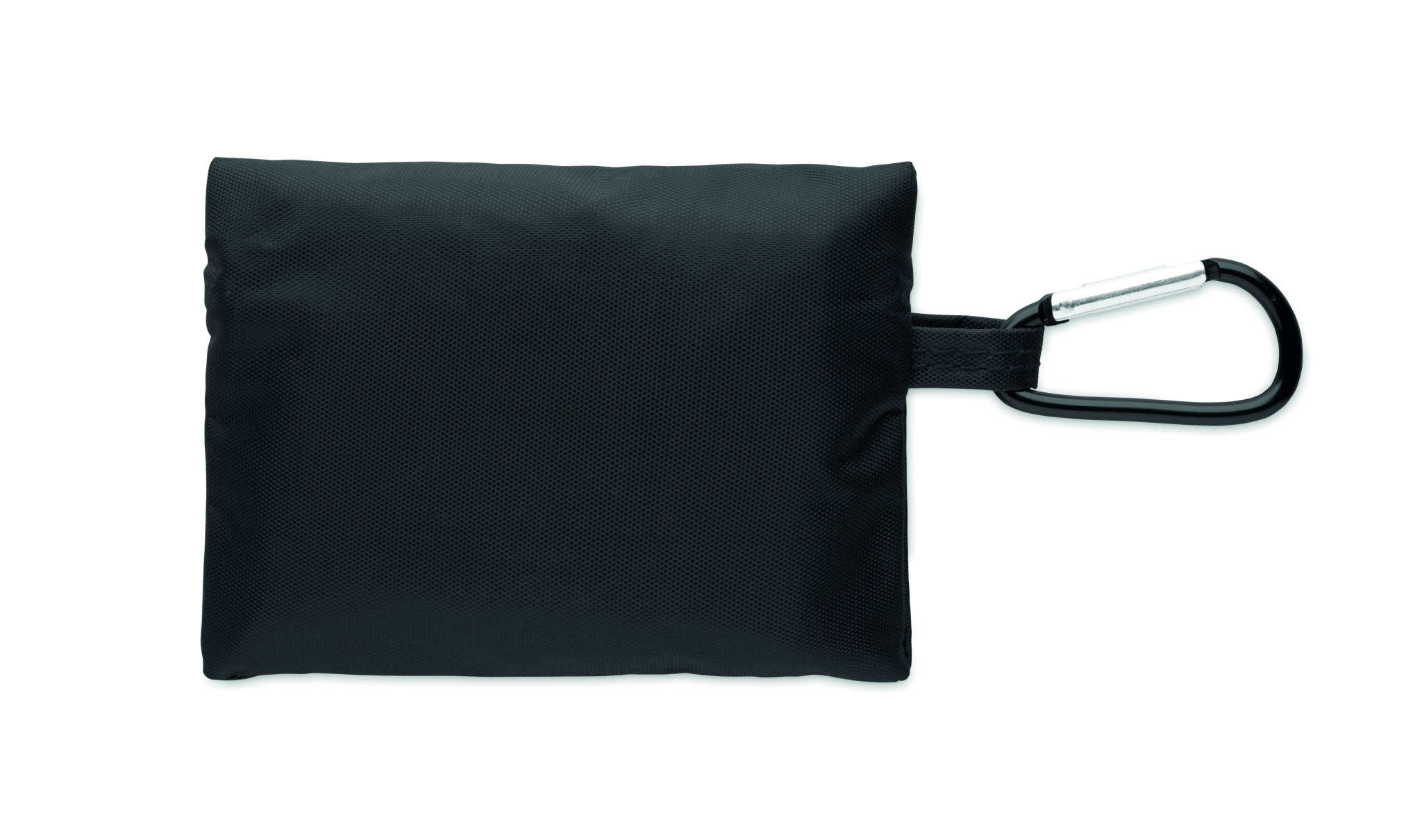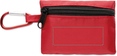 Compact first aid kit in RPET pouch with aluminium carabiner. Includes 4 alcohol swabs, 3 plasters, 2 bandages, 2 gauze pads, 1 tape, and 1 scissors. Not available for sale outside the EU.