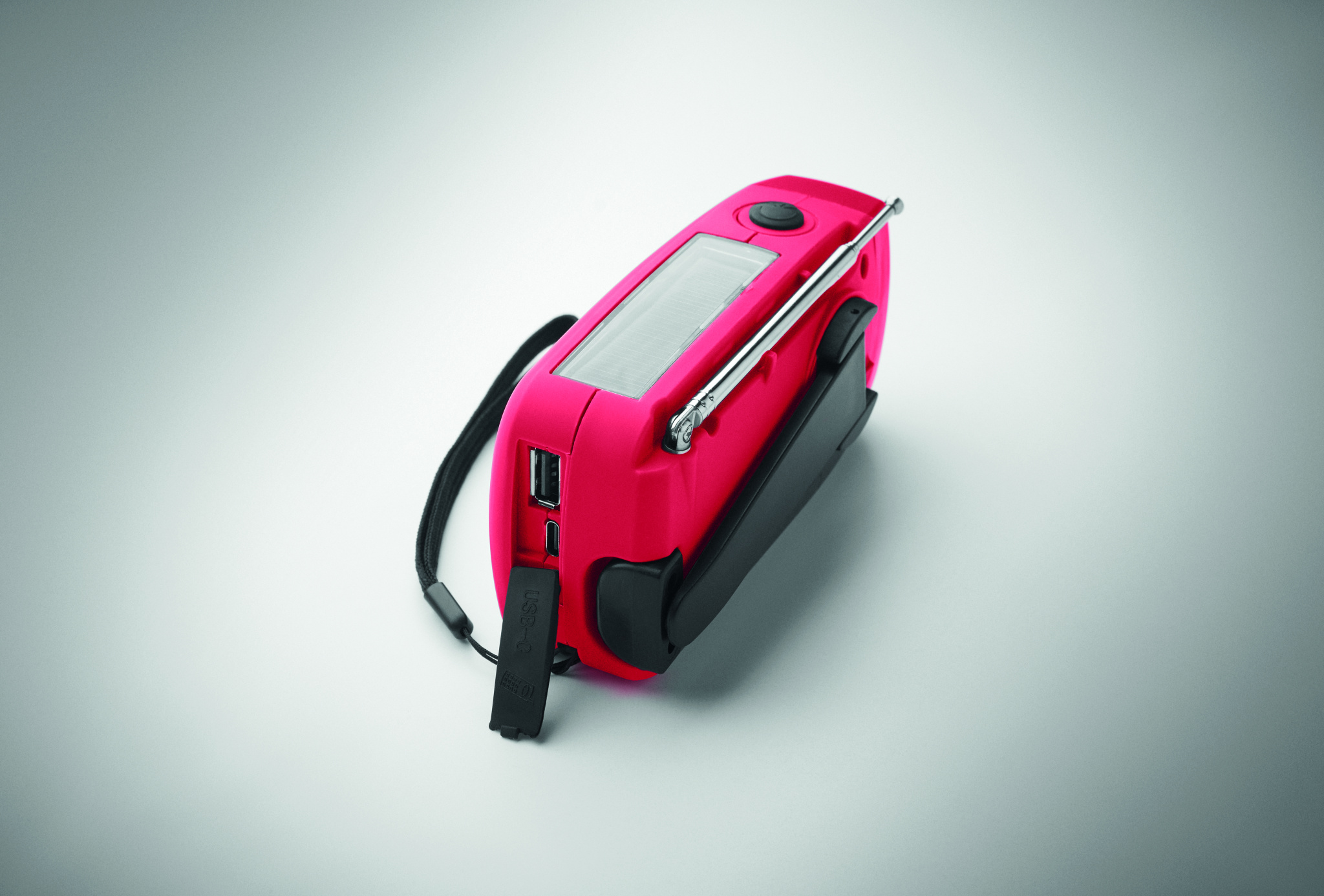 Portable AM/FM radio in ABS with LED Torch (2 settings) and a 1200mAh Power bank for emergency charging. Self powered by solar and hand crank.