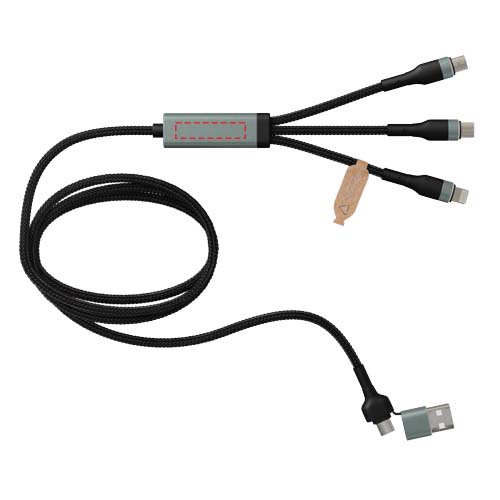 Кабель для сверхбыстрой заряжки 5-в-1, изготовленный из rPET, мощностью 100 Вт, которым можно заряжать смартфоны, планшеты и ноутбуки. Двойной вход USB-A + USB-C делает кабель на 100% совместимым с новейшими моделями компьютеров. Выходная мощность: Type-C, Micro USB и Lightning. Поставляется с чехлом из перерабатываемого TPU и вкладышем, напечатанным на переработанной бумаге. Длина кабеля: 1 метр