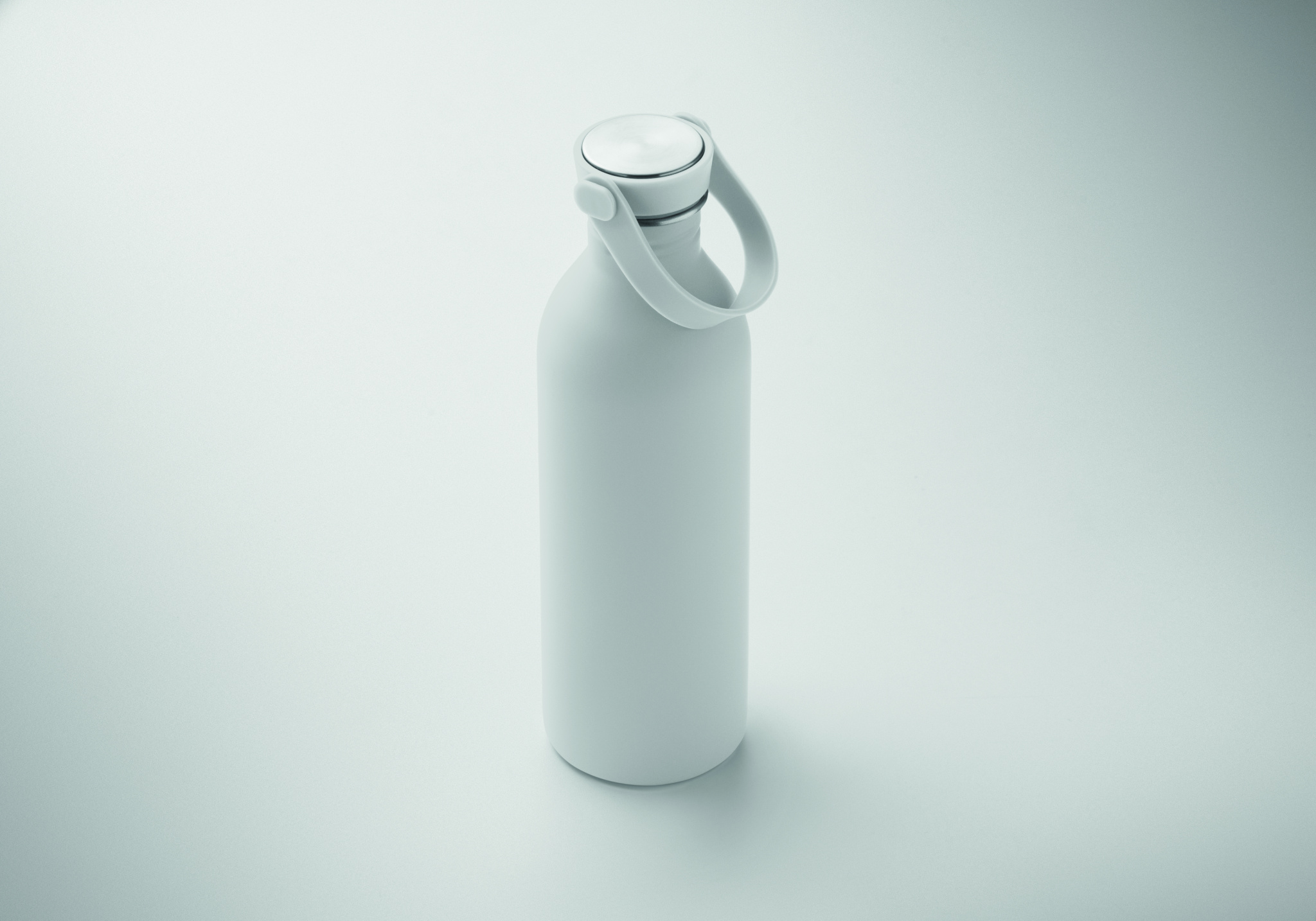 Single wall bottle made of 90 % recycled stainless steel and 10% stainless steel with rubber finish. Includes PP and SS lid with silicone handle. Capacity: 500 ml.