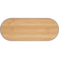 Тонкая пластиковая зарядная станция с бамбуковой поверхностью и двумя индукционными зарядными точками для смартфонов, включая кабель для зарядки. Ваш логотип будет выгравирован на станции.