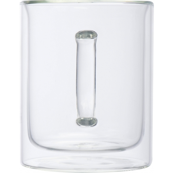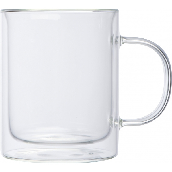 Dubbelväggig kopp av borosilikatglas med en fyllningskapacitet på 350ml. Vi trycker din logotyp på koppen genom keramisk överföring. All-around utskrift möjligt på begäran.