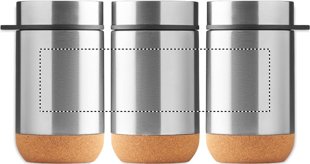 Dubbelväggig isolerad förvaringsburk i rostfritt stål med skruvlock och korkbottendetalj. Inklusive sked. Kapacitet: 400 ml.