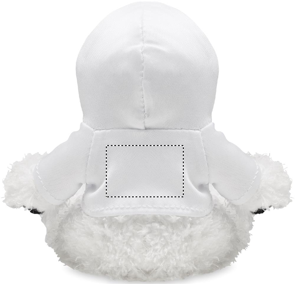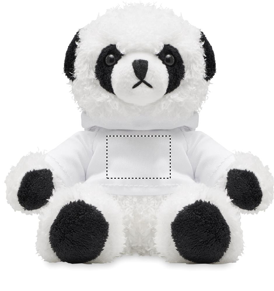 Pandabjörn i plysch som bär en tröja med huva. Rekommendera med sublimeringstryck.