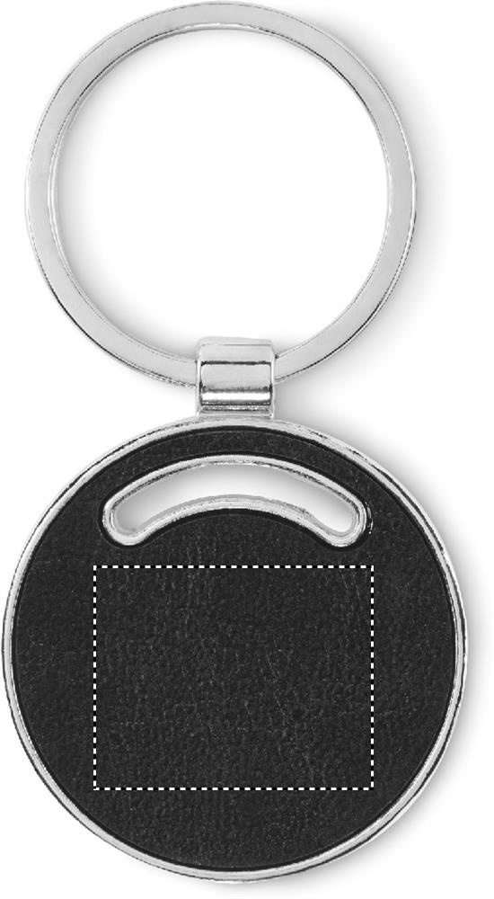 Rund nyckelring i metall med inlägg av återvunnet PU-läder.