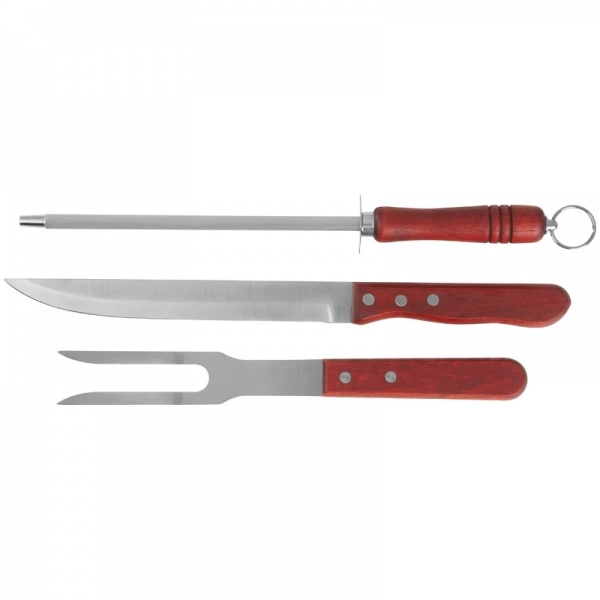 Snygg skärkniv och gaffel som består av en snidkniv, en gaffel och en knivslipare. Förpackad i en fin trälåda. Din logotyp kommer att tryckas på trälådan.