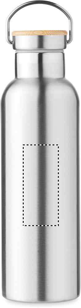 Isolerande vakuumflaska i rostfritt stål med lock i bambu och bärögla. Passar för både varma och kalla drycker. Volym: 750ml. Tål diskmaskin (lock handdisk). Läcker inte.
