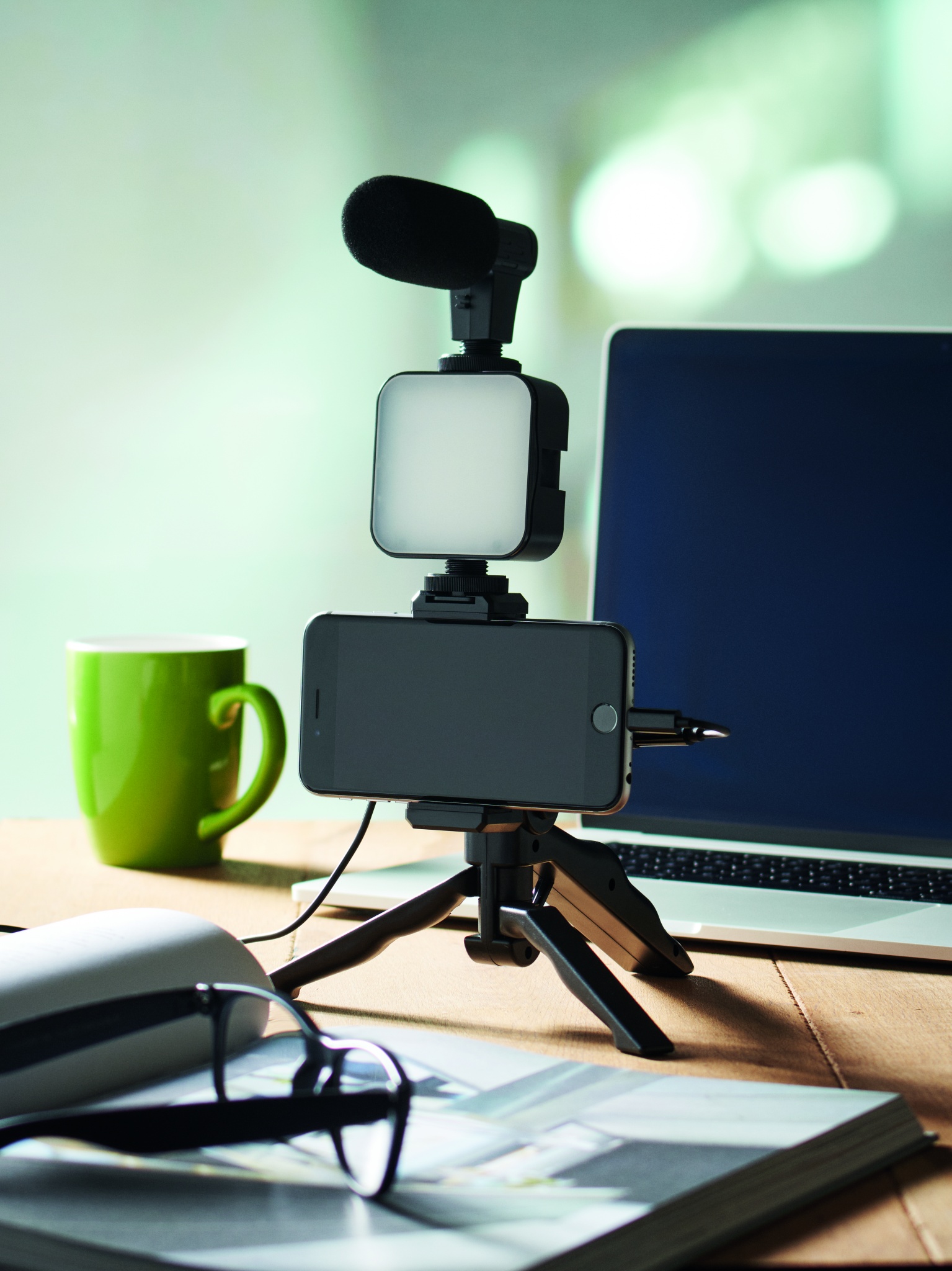 Videokit för smarttelefoner. Inkluderar justerbart stativ med telefonfäste och mikrofon. LED-ljus med 10 ljusinställningar. Exklusive 2 x typ-AA-batterier.